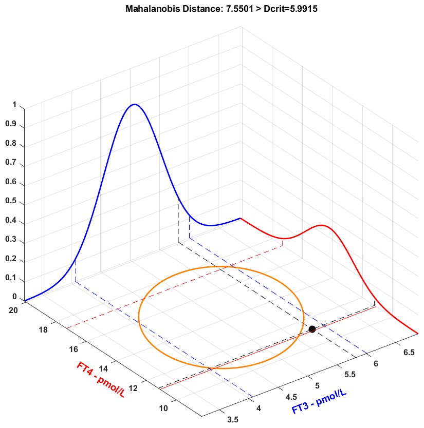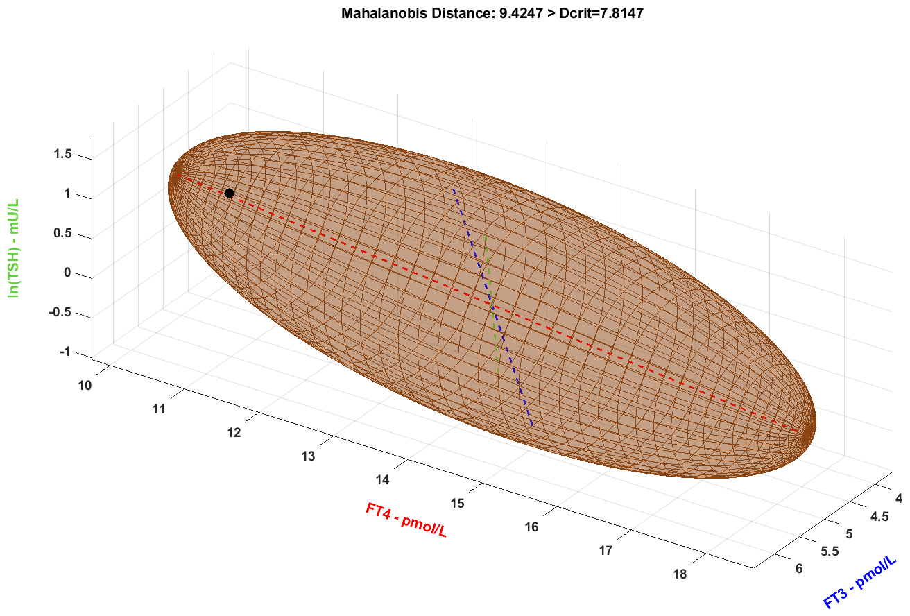 La determinazione del classico profilo tiroideo (TSH, fT4, fT3) può essere molto fuorviante se ci si ferma a guardare solo i valori e gl’intervalli di riferimento. Gli intervalli di riferimento dei 3 ormoni tiroidei possono essere geometricamente rappresentati: se i valori del paziente sono all’interno dei 3 intervalli di riferimento, questi può essere rappresentato come un punto all’interno della “scatola” determinata dai 3 intervalli. Questo sarebbe corretto se le distribuzioni dei 3 ormoni fossero uniformi e tra di loro indipendenti. Il fatto che le 3 distribuzioni siano gaussiane e tra di loro dipendenti fa sì che gli intervalli non siano lineari ma “curvati” (Hoermann R. et al. Eur. J. Endocrinol. 2016:174,735–43). In questo modo, una coppia di intervalli determina un’ellissi e un trio determina un ellissoide. Tale incurvamento fa sì che molti soggetti classificati come distiroidei siano, in realtà, normali e che alcuni soggetti classificati come eutiroidei siano, in realtà, distiroidei. La distanza di un punto dall’ellisse/ellissoide non può essere calcolata usando la distanza euclidea (come si farebbe se i 3 ormoni fossero indipendenti e uniformemente distribuiti) ma usando la distanza di Mahalanobis. Se la distanza di Mahalanobis del soggetto è inferiore alla distanza di Mahalanobis critica, allora il soggetto è all’interno dell’ellisse/ellissoide.